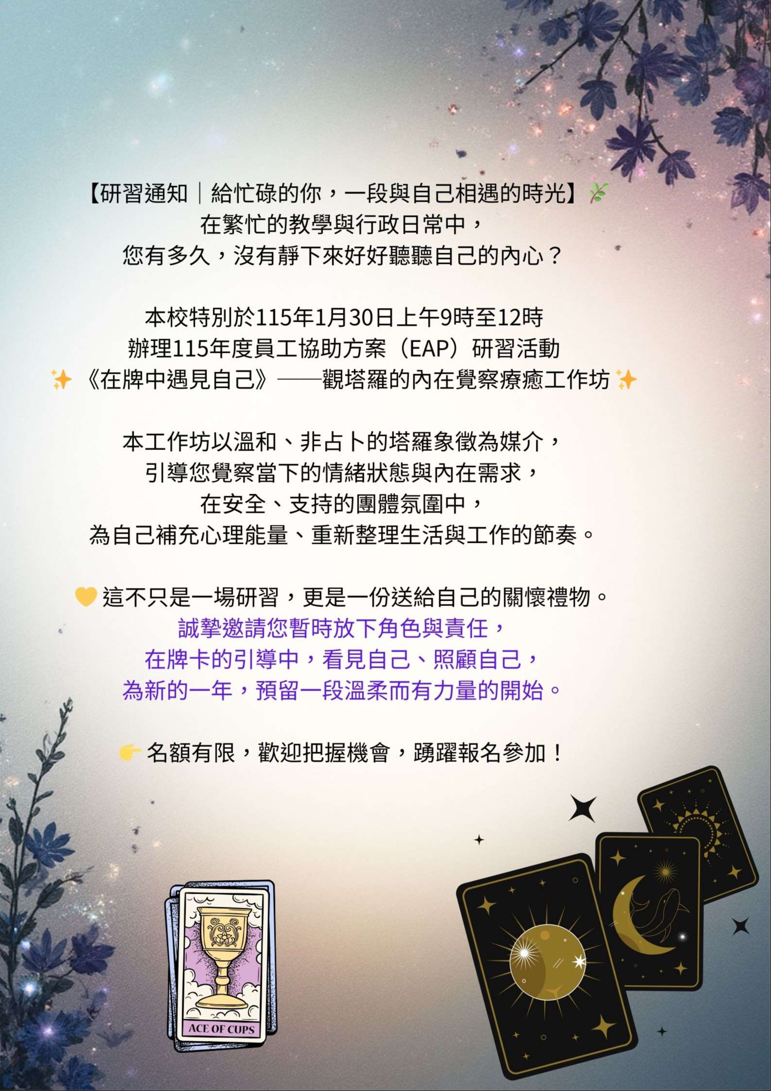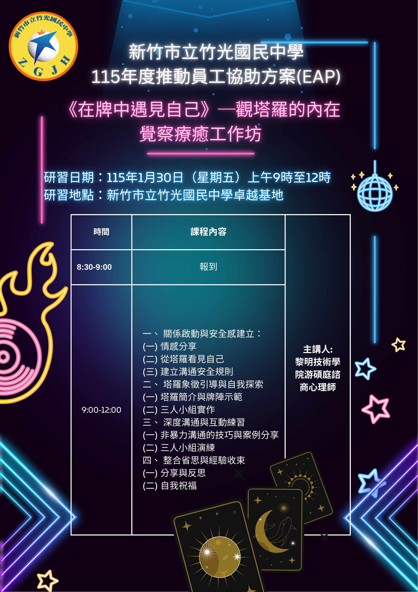 轉知新竹市立竹光國民中學將於115年1月30日(星期五)上午辦理「115年 度推動員工協助方案(EAP)《在牌中遇見自己》──觀塔羅的內在覺察療癒工作坊」,歡迎有興趣的同仁報名參加。