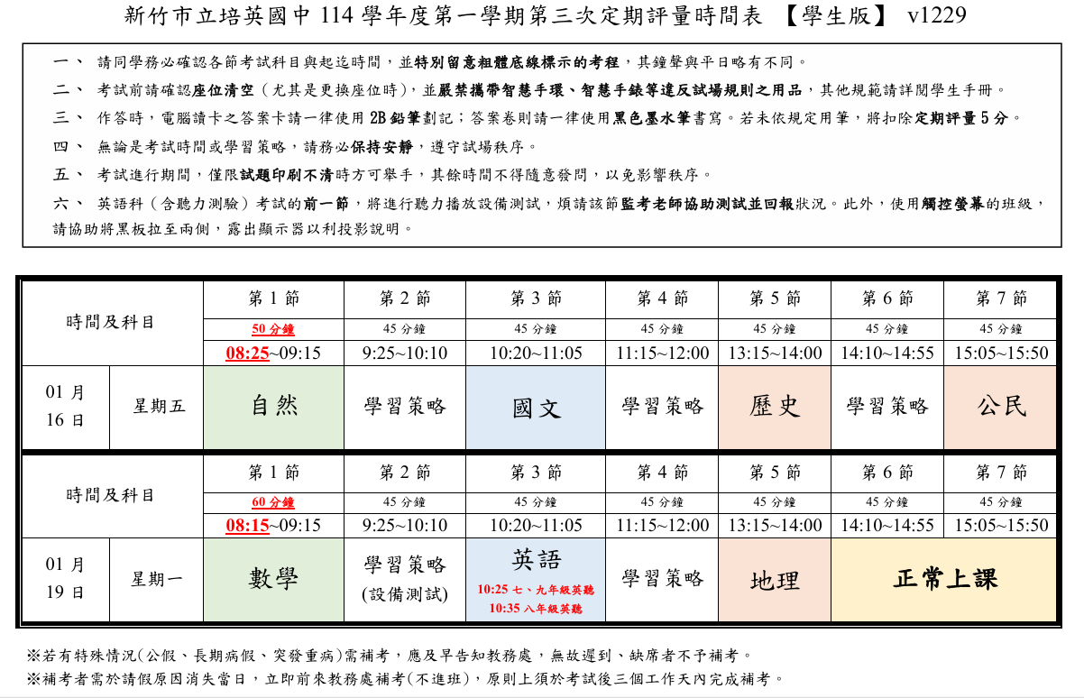 附件為114學年度第一學期第三次定期評量考程表,請參閱。