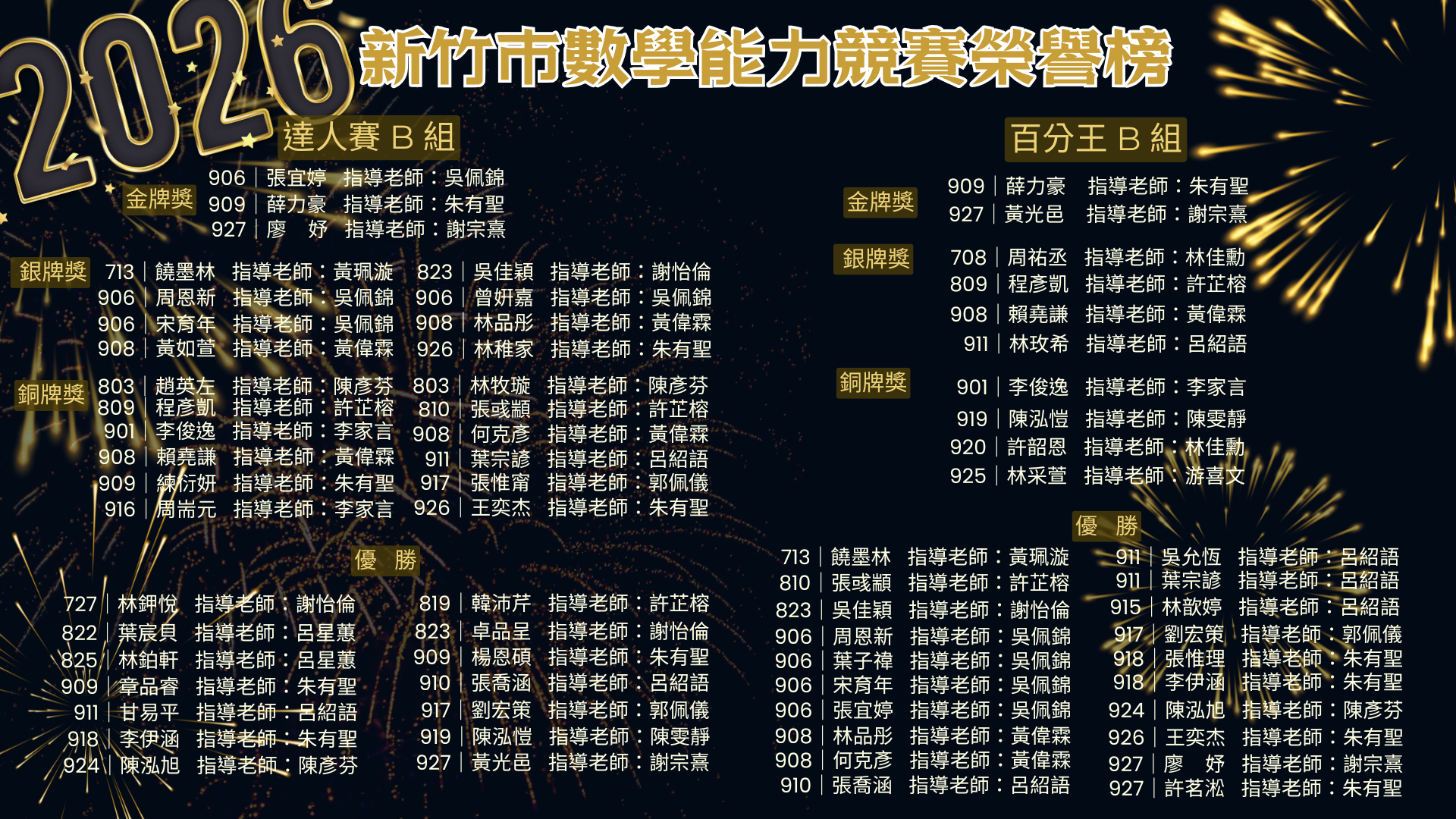 本校同學參加「新竹市114學年度國中數學能力競賽」,表現卓越!恭喜以下獲獎同學,並感謝指導老師們的辛勤耕耘!