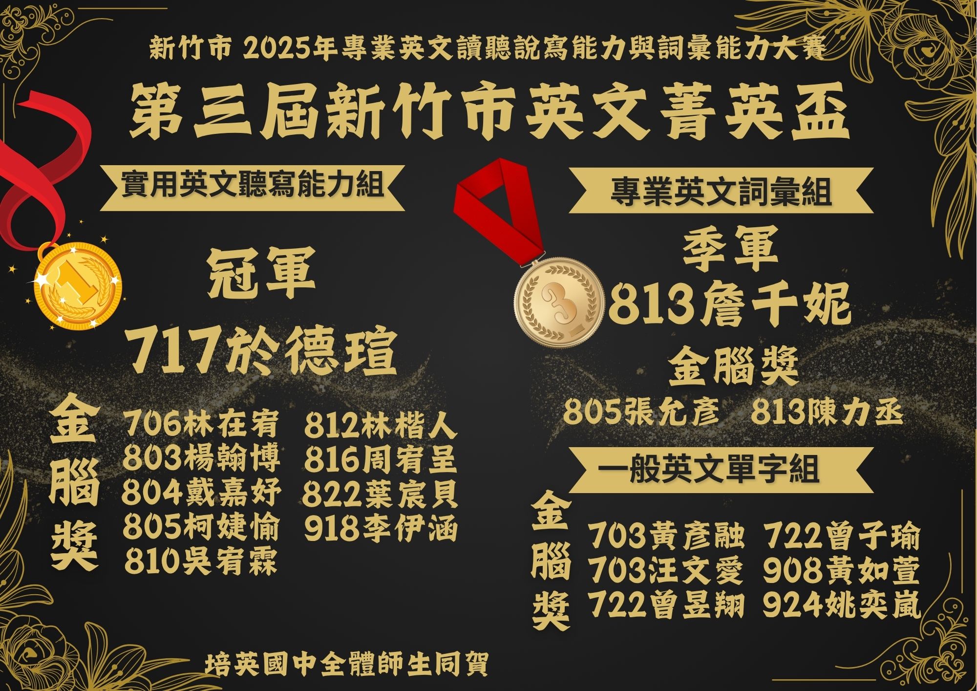 實用英文聽寫能力組金腦獎706林在宥、803楊翰博、804戴嘉妤、805柯婕愉、810吳宥霖、812林楷人、816周宥呈、822葉宸貝、918李伊涵