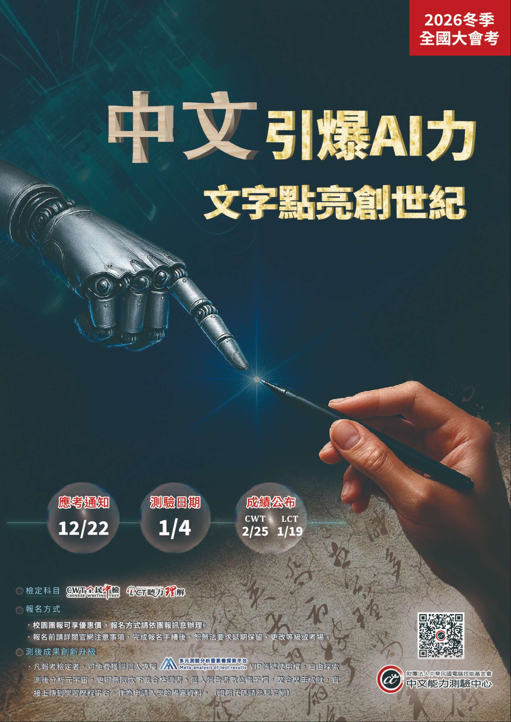 2026中文能力測驗中心冬季全國大會考」將於2026年1月4日舉辦請自行瀏覽附件