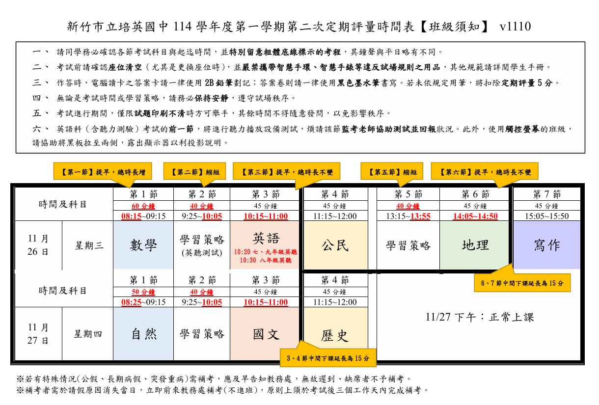 附件為114學年度第一學期第二次定期評量考程表,請參閱。
