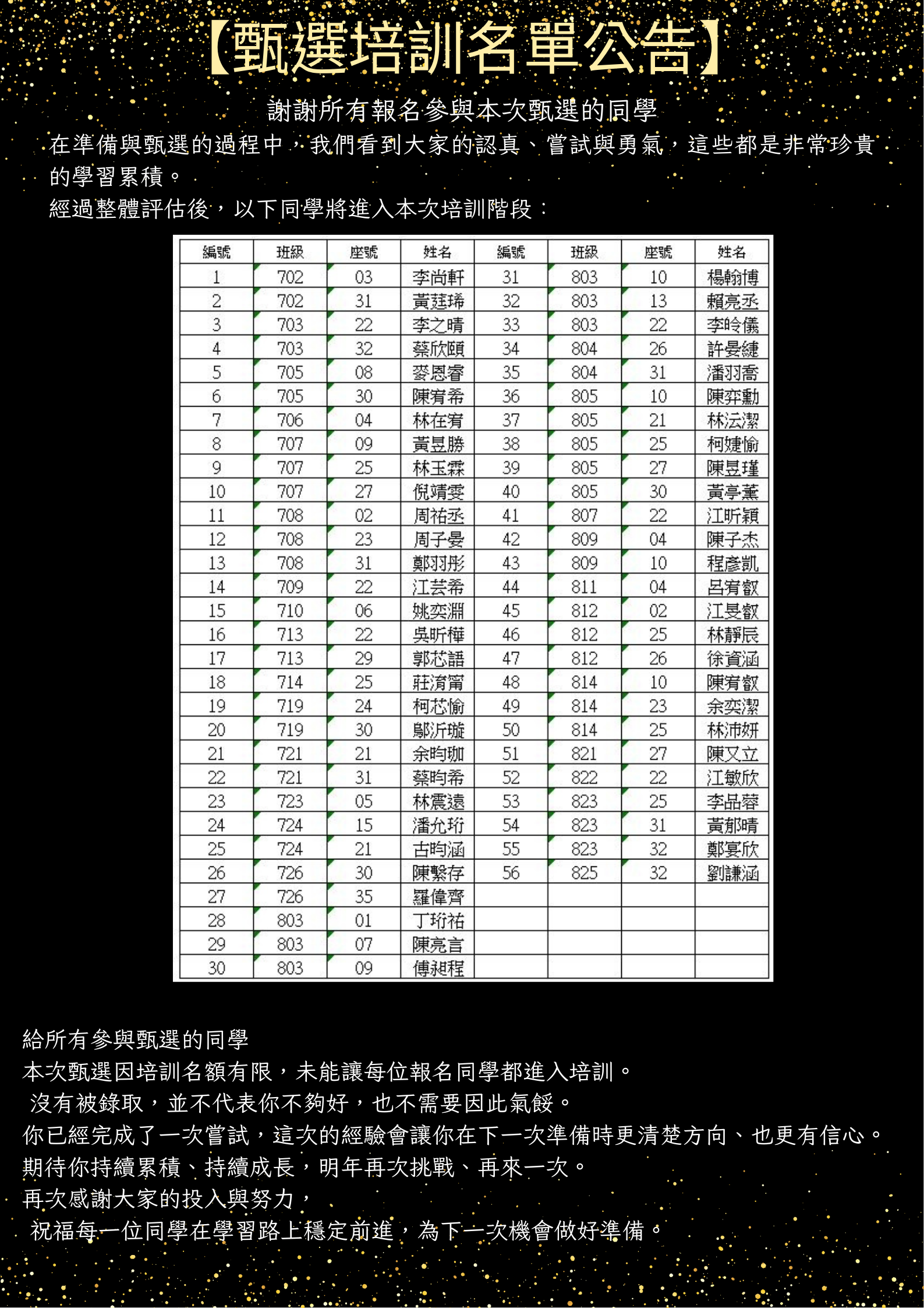 謝謝所有報名參與本次甄選的同學。在準備與甄選的過程中,我們看到大家的認真、嘗試與勇氣,這些都是非常珍貴的學習累積!