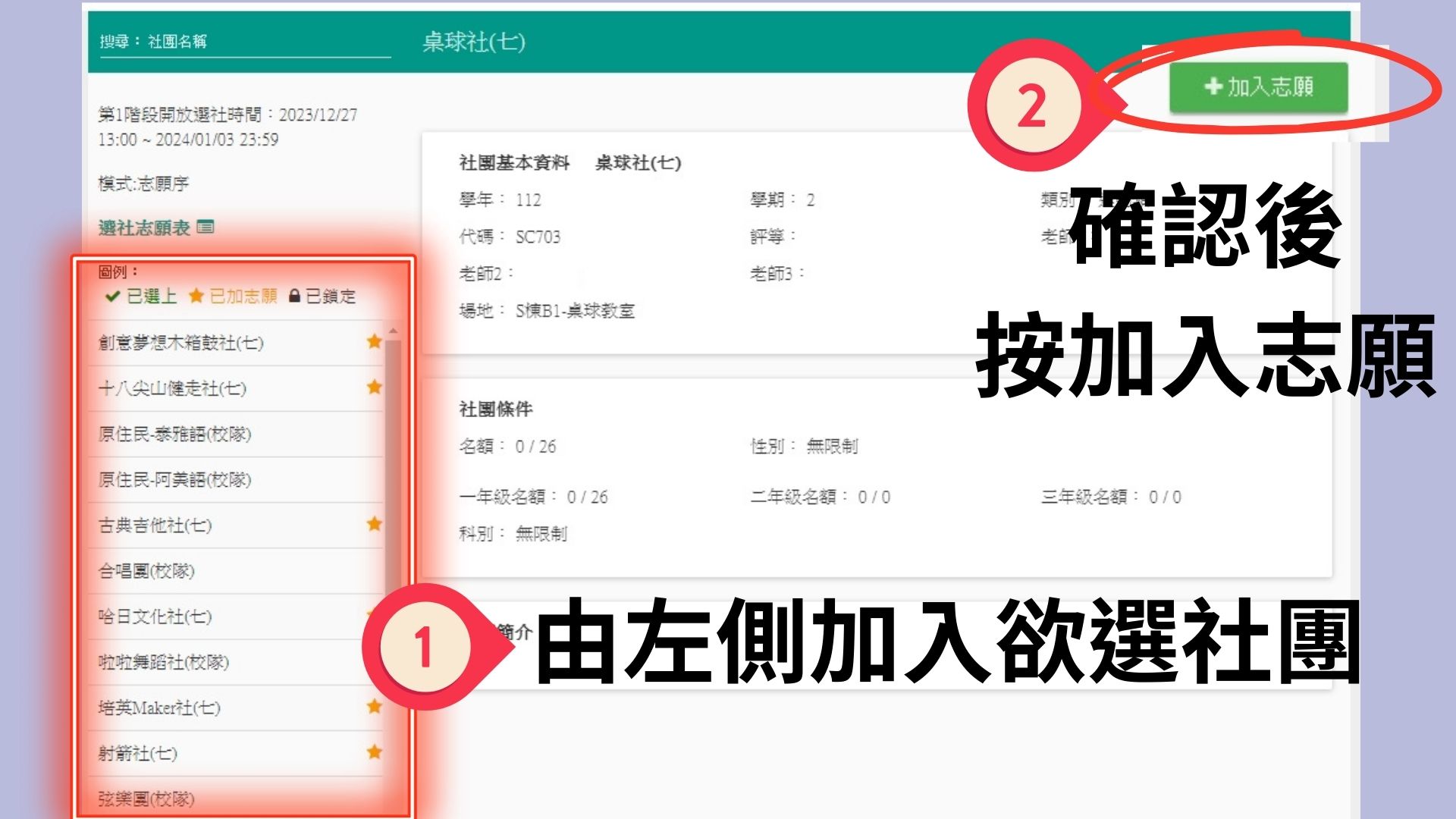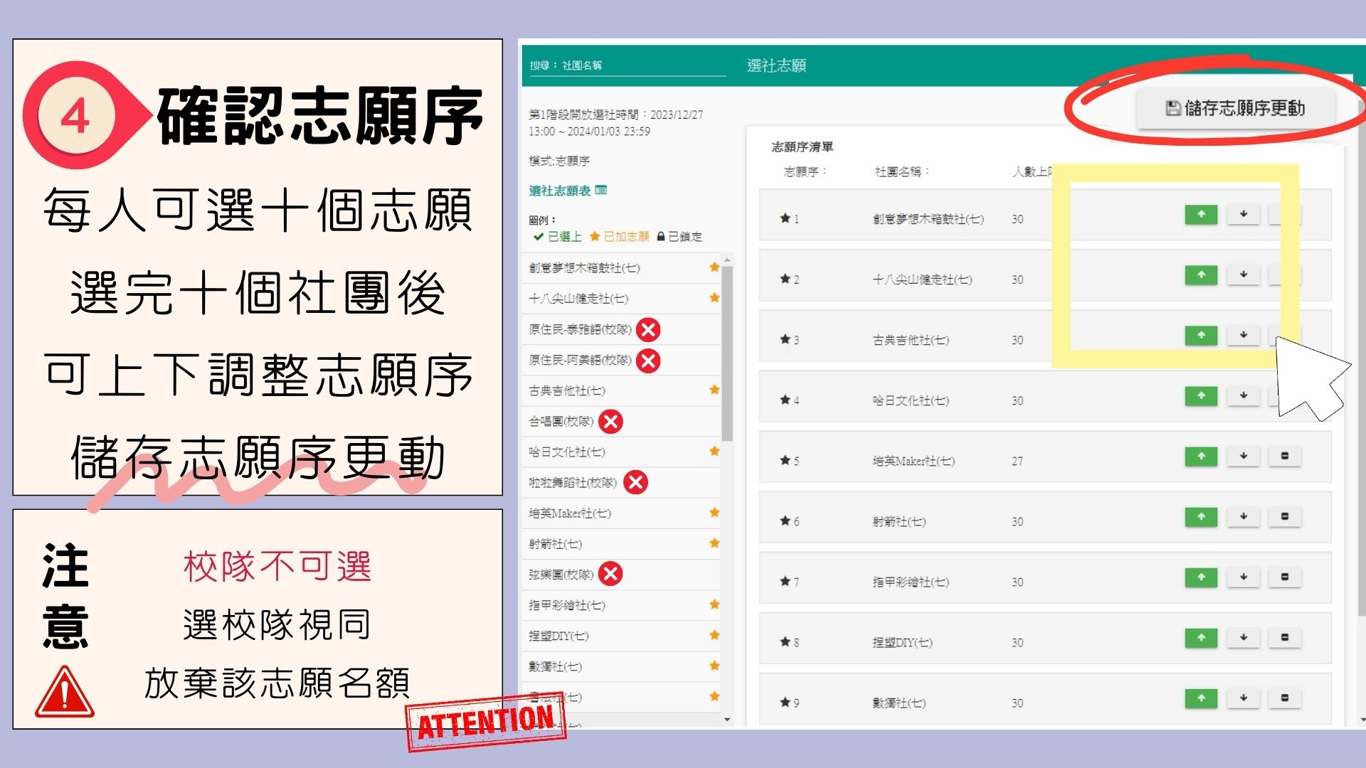 *請同學於截止日前上網選填社團志願(十個志願都需填滿,否則志願沒上會依系統亂數安排)