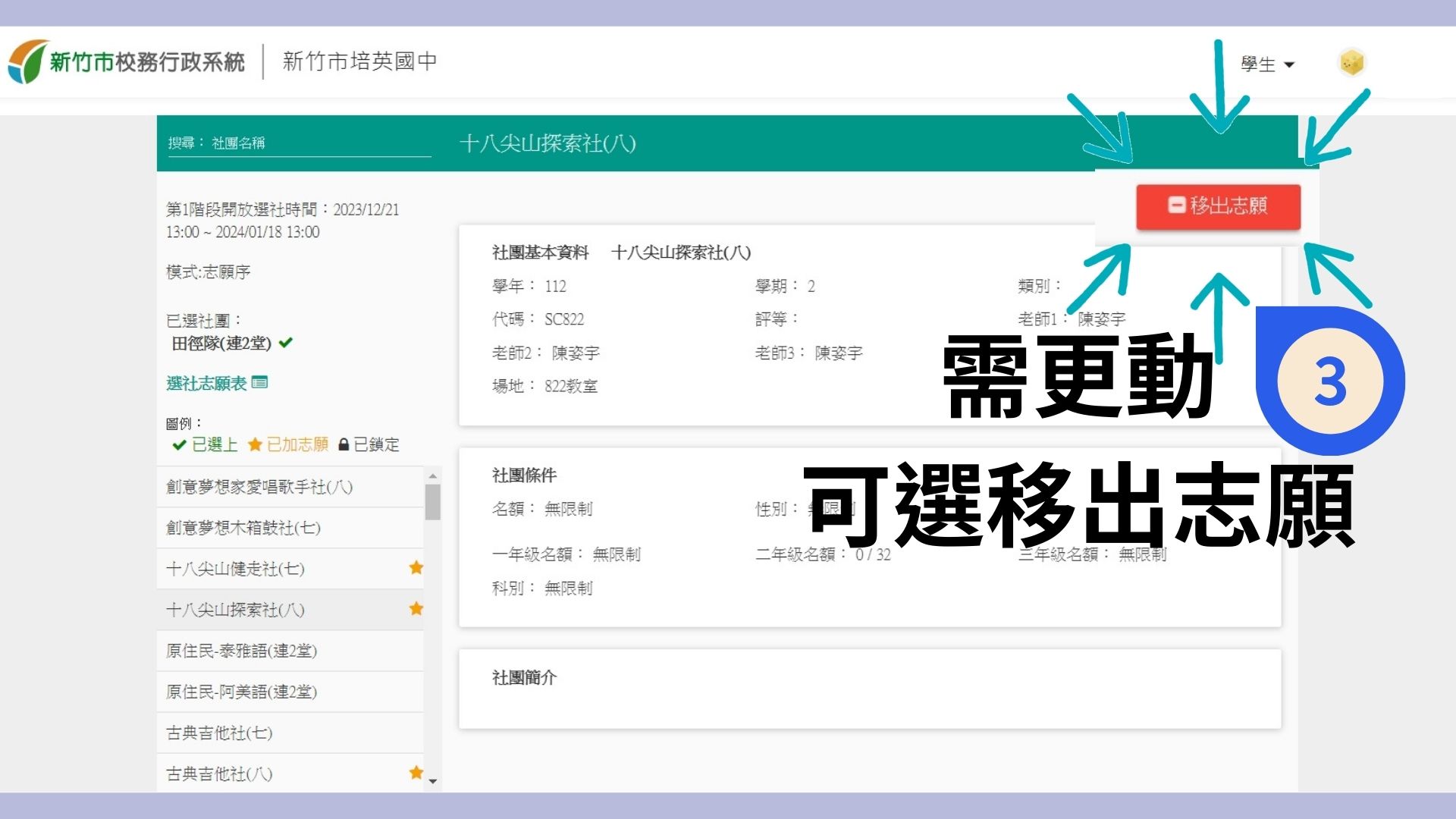 截至當天仍未選社的同學,則由系統亂數安排社團,不得有異議