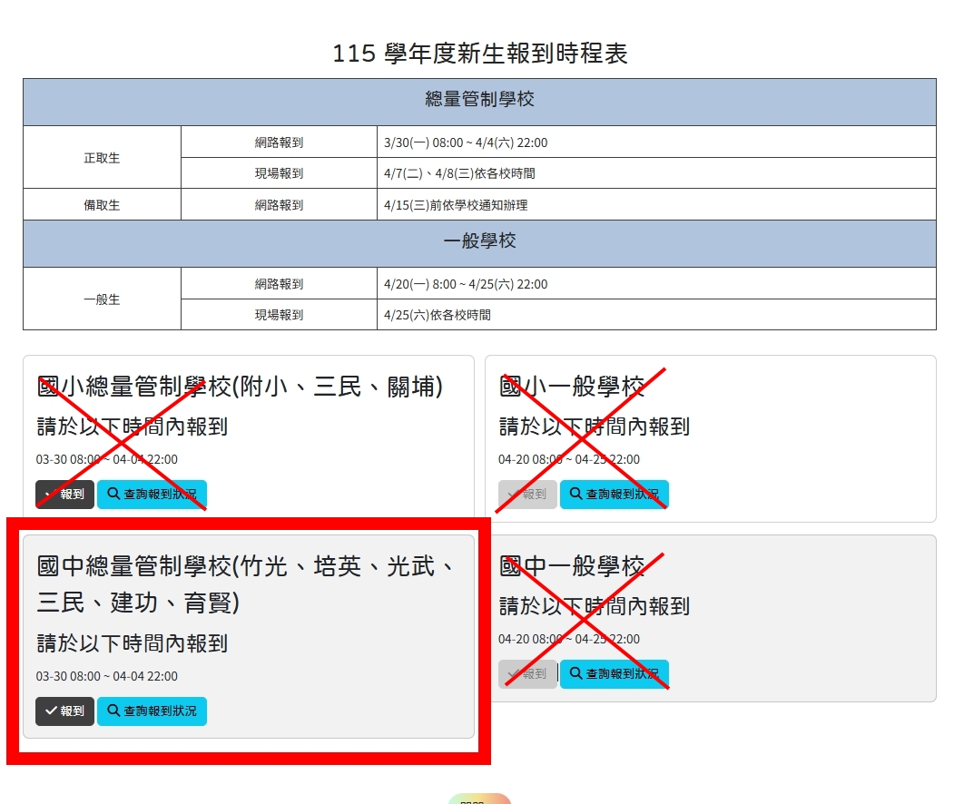 (三)紙本通知單上所列3/30~4/4網路線上報到、4/7、4/8現場報到,兩種方式擇一完成即可。未於4/8中午前完成報到手續者以放棄入學資格論由備取者遞補。