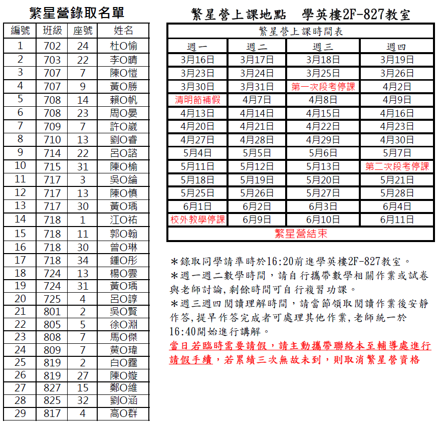 本學期繁星營錄取名單(如下圖)已彙整完畢